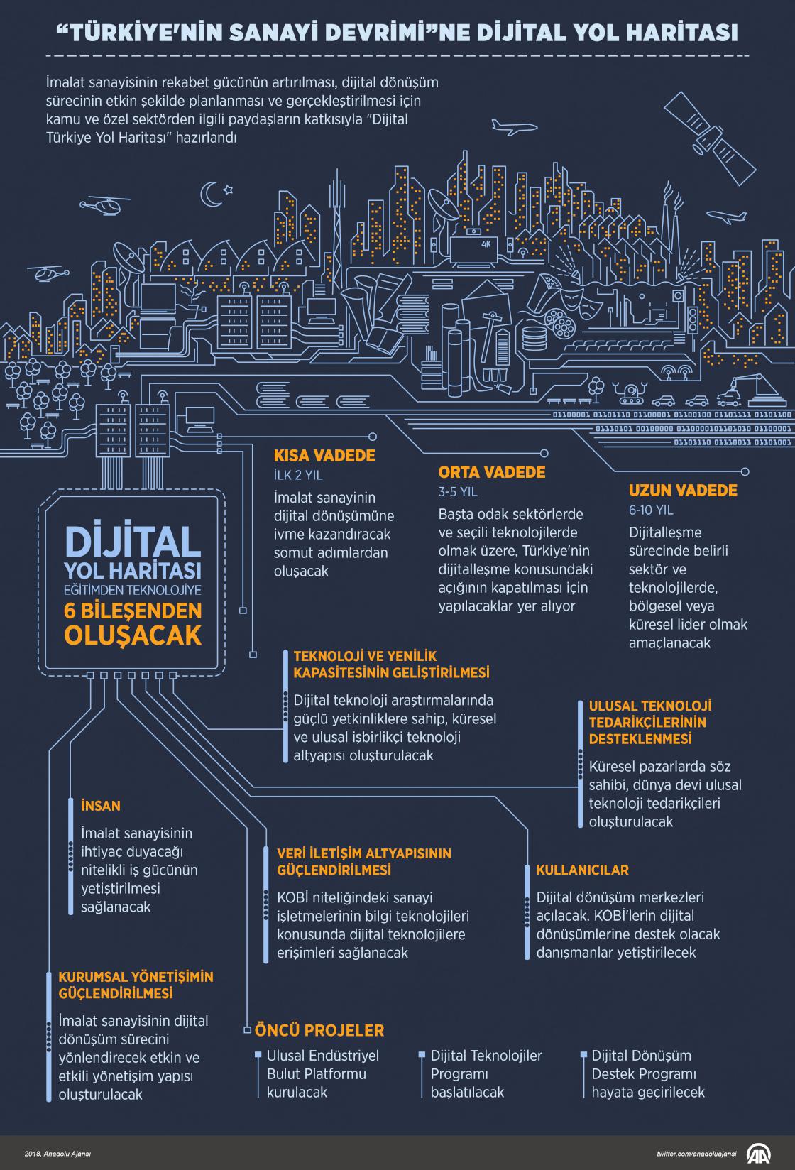 İmalat sanayisinin rekabet gücünün artırılması hedefiyle hazırlanan “Dijital Türkiye Yol Haritası”, “insan, teknoloji, altyapı, tedarikçiler, kullanıcılar ve yönetişimi” odağına alan 6 bileşenden oluşuyor.